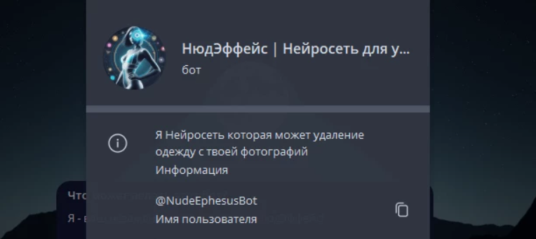 НюдЭффейс — относительно новый русскоязычный Telegram-бот с базовыми алгоритмами и без лишних усложнений. Он умеет «раздевать» девушек на фото, при этом лучше всего показывает себя на купальниках и обтягивающей одежде. С оверсайз-вещами результаты обычно менее стабильны. Ключевые особенности бота: