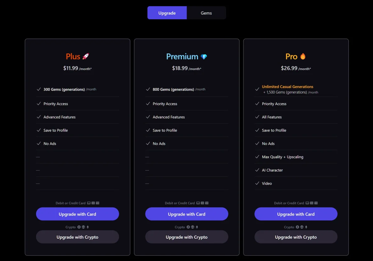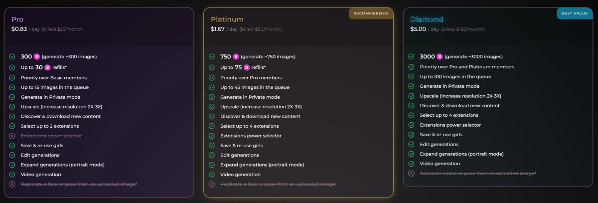 Seduced AI предлагает несколько платных тарифов. Для доступа к расширенным генерациям и дополнительным преимуществам требуется подписка. Примеры планов и цен: