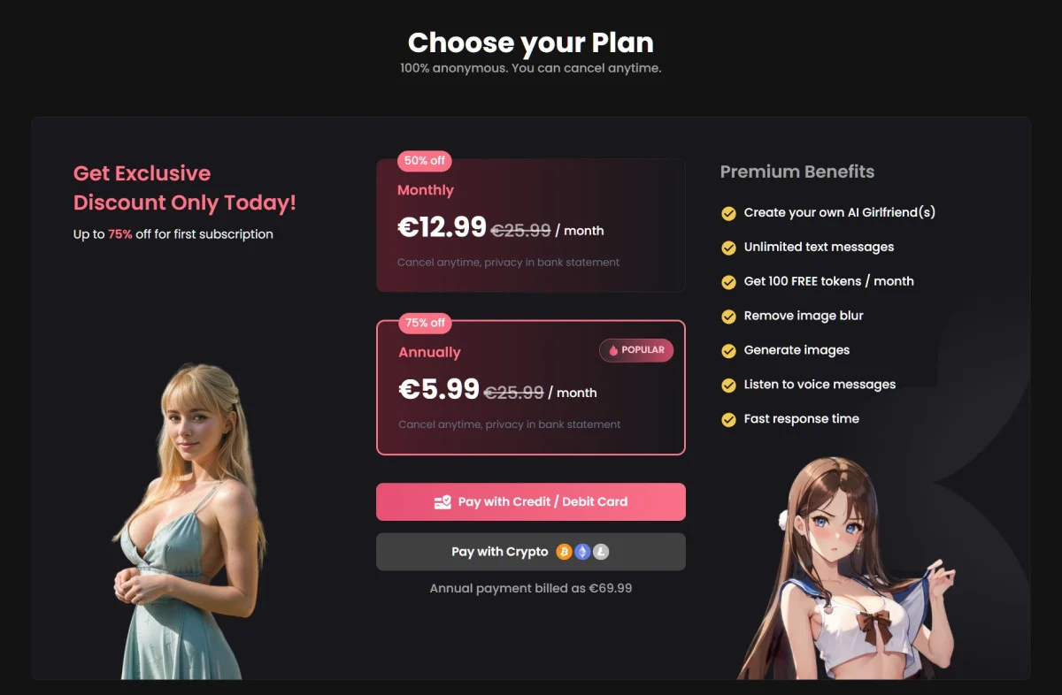 Candy.ai предлагает несколько платных тарифов. Бесплатный доступ ограничен по функционалу, и чтобы получить расширенные возможности, потребуется подписка. Тем не менее цены остаются сравнительно доступными для подобных сервисов.