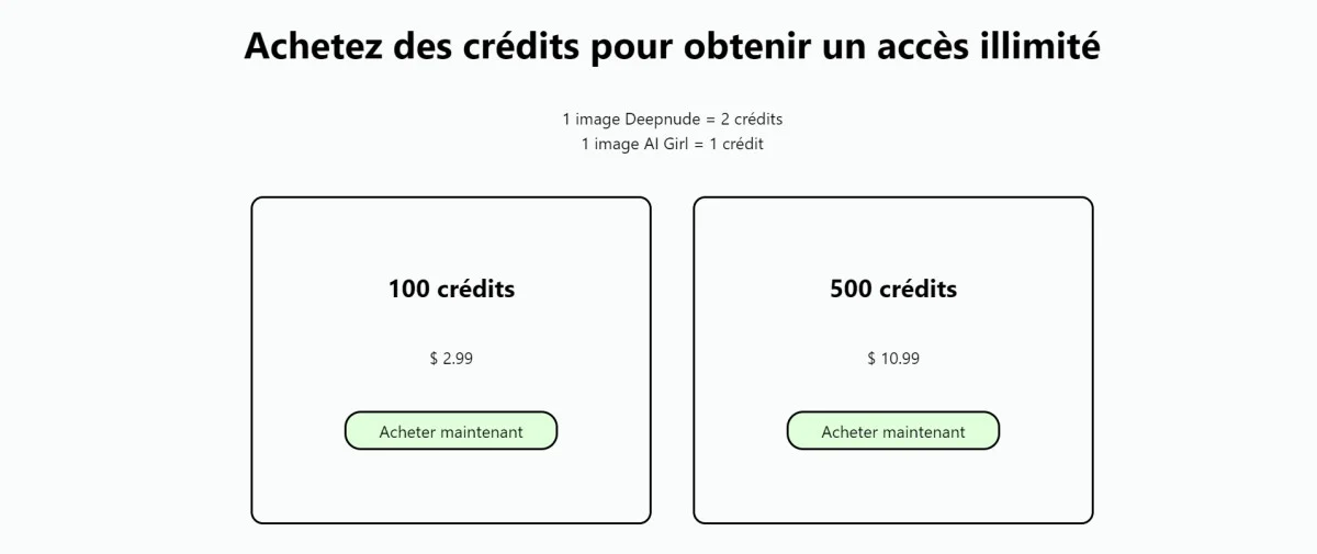 Хотя базовая функция доступна бесплатно, для практически неограниченного использования сервиса требуется подписка или покупка кредитов. Количество возможных «раздеваний» зависит от выбранной тарифной формулы и числа приобретённых кредитов. Обычно предлагаются два основных варианта пакетов кредитов.