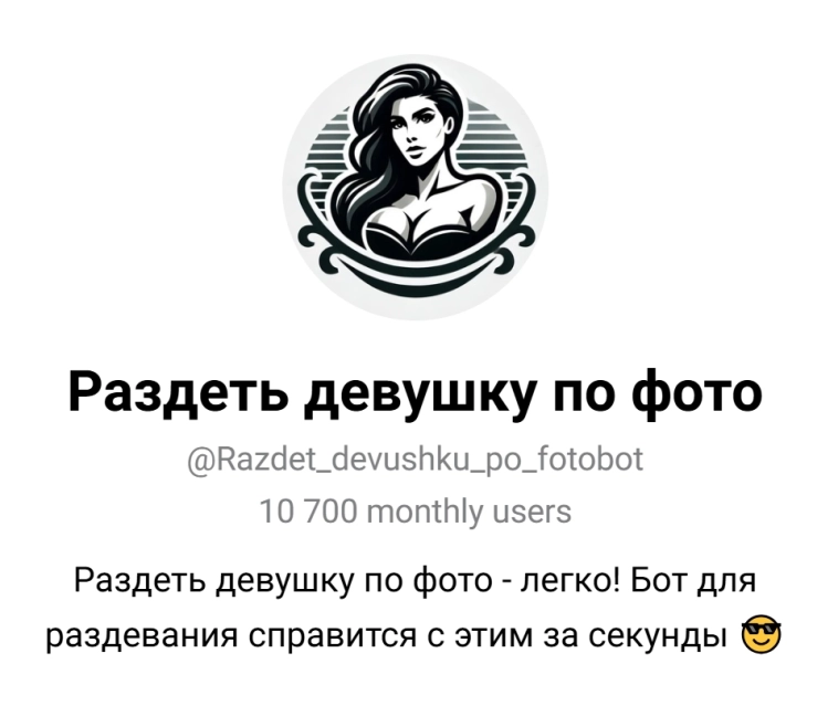 Описание: Этот бот который раздевает по фото делает упор на дипфейки и создание ню-контента с заменой лиц. Подойдёт тем, кто хочет раздеть девушку по фотографии и параллельно экспериментировать с уникальными образами.