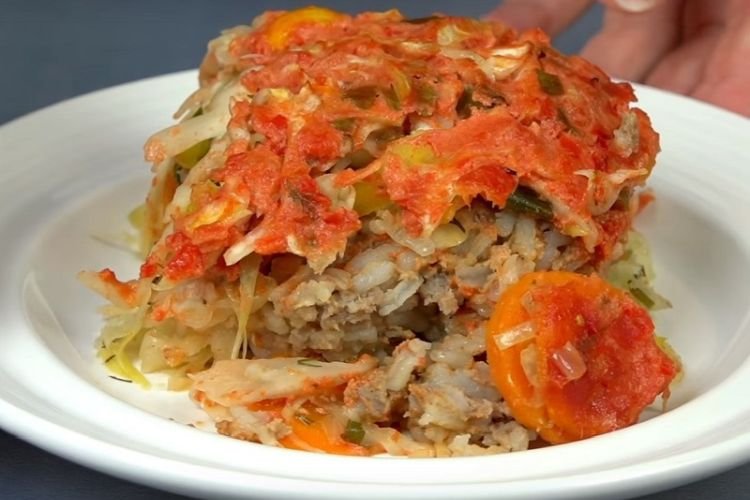Приготовление: Нашинкуй капусту, измельчи морковь, лук и перец и обжарь все вместе. Отдельно отвари рис до полуготовности, смешай с фаршем и приправь. Выложи в форму половину капусты, фарш и снова капусту. Измельчи томаты в собственном соку, смешай со сметаной и залей заготовку. Запекай блюдо в духовке 40–45 минут при 220 °C под фольгой.