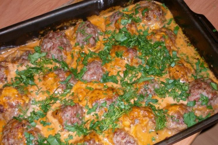 Приготовление: Смешай фарш со специями, зеленью и половиной луковицы и сформируй небольшие фрикадельки. Измельчи оставшийся лук, морковь и перец и обжарь 5–7 минут до мягкости. Добавь сметану, воду и специи и протуши еще пару минут. Выложи в соус фрикадельки и продолжай тушить 15–20 минут до готовности.