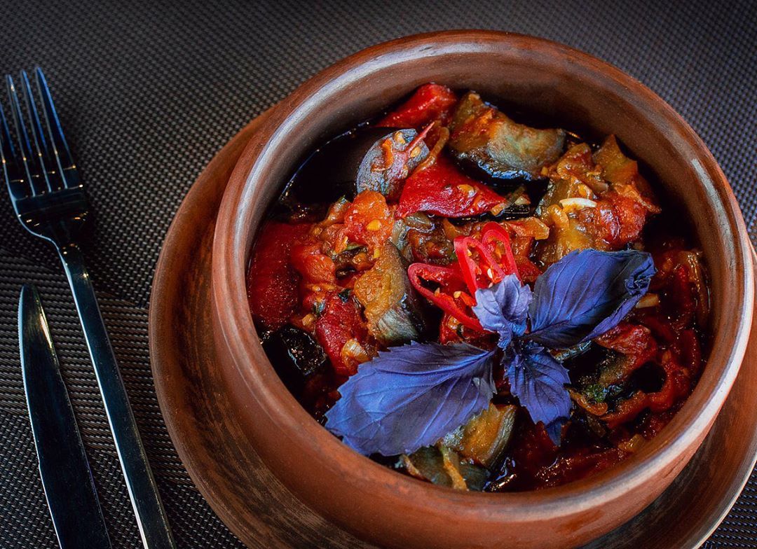 Грузинская кухня — аджапсандали (овощное рагу: баклажан, перец, помидор)