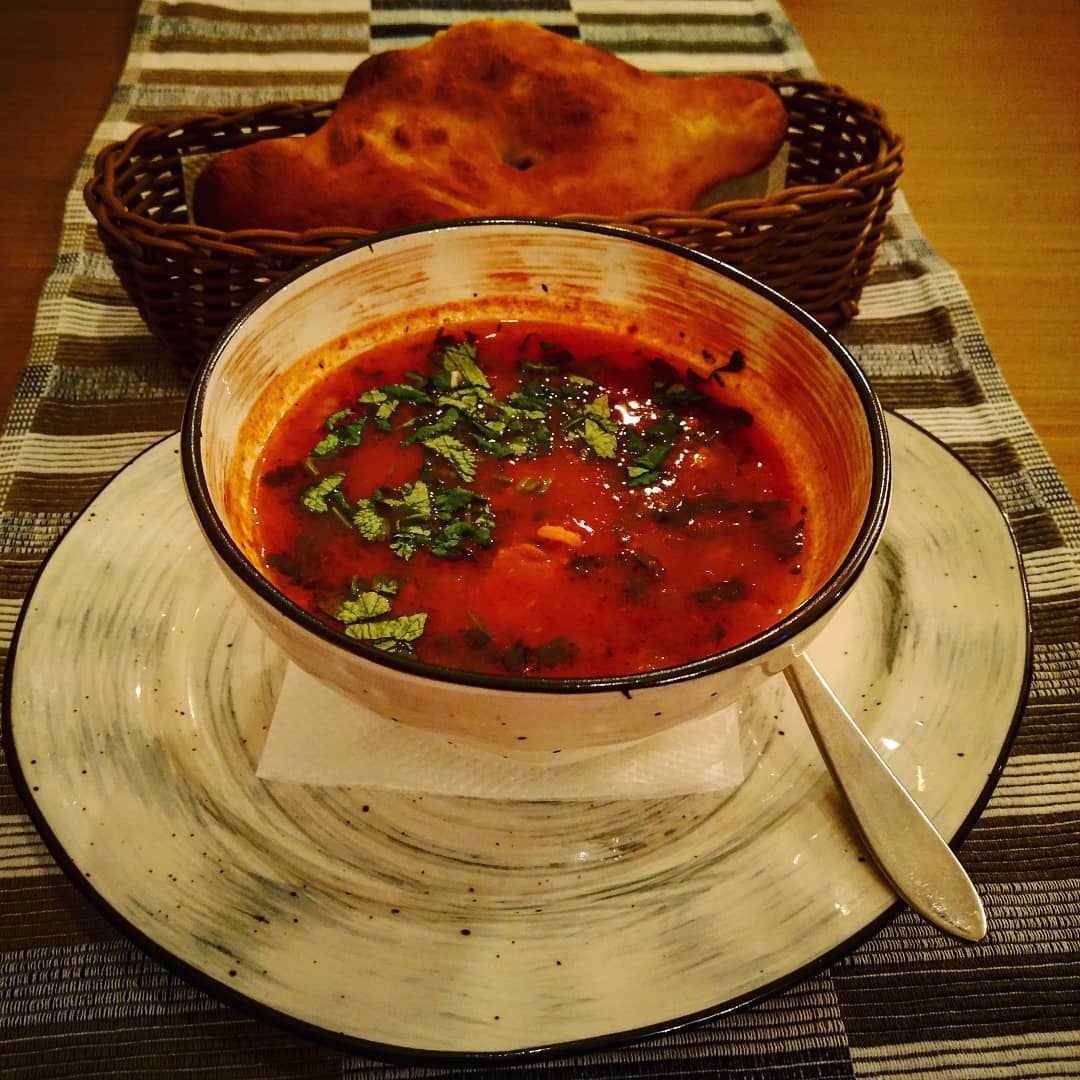 Грузинская кухня — харчо (традиционный суп из говядины, пряности и ткемали)