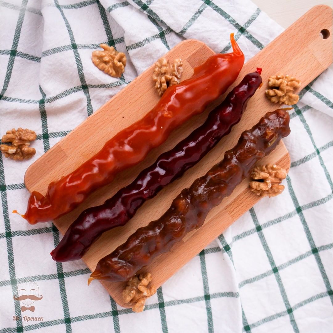 Чурчхела — национальная сладость грузинского происхождения которая полюбилась многим народам. Состоит чурчхела из двух частей: одна нанизанные на нитку очищенные орехи представляющий собой начинку. Вторая застывший виноградный сок с мукой, который окутывает всю начинку и является оболочкой.