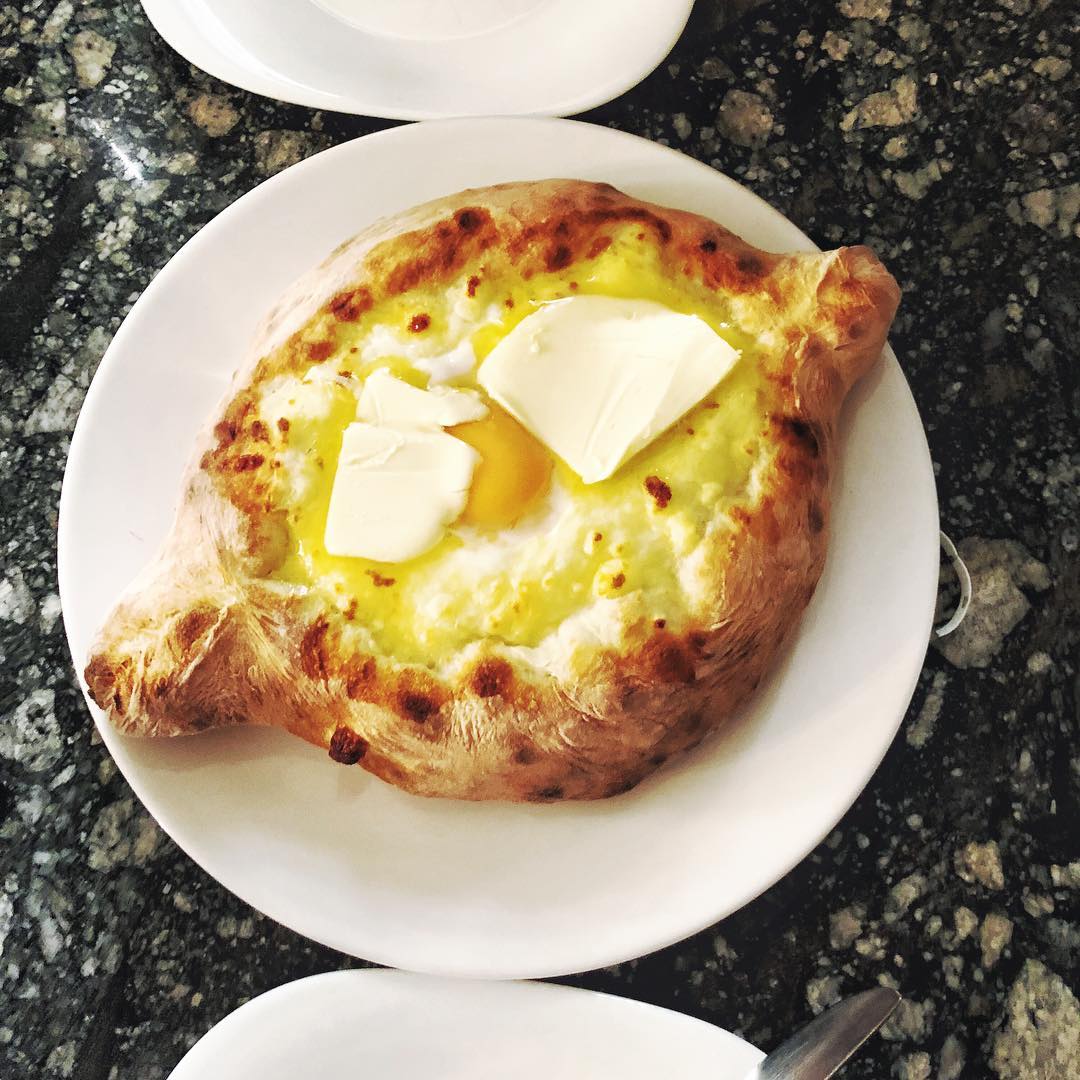 Хачапури по аджарски — тесто в форме лодочки, а посередине большая концентрация сыра, масло и яйца.