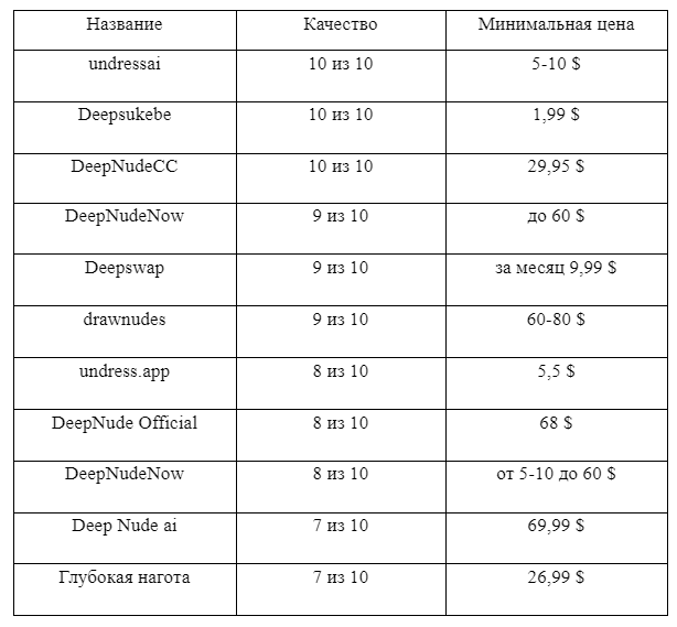 Таблица сравнений сайтов для раздевания по фото (нейросети)