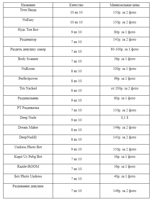 Таблица сравнения ботов для раздевания по фото (нейросети)