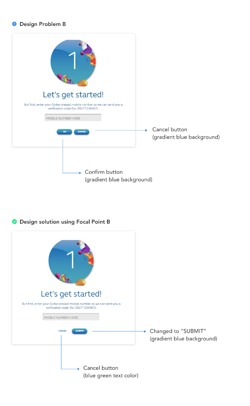 Решение: поменять кнопки местами, сделать кнопку подтверждения более заметной (например, цветной заливкой) и изменить подпись с OK на Submit, чтобы пользователю было понятнее, какое действие будет выполнено. Второстепенную кнопку оформить нейтрально, с белым фоном и тонкой обводкой.