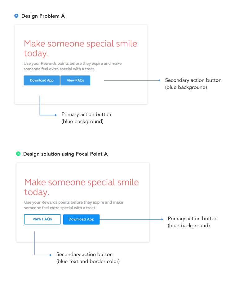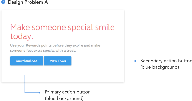 Проблема A: кнопки основного и второстепенного действия выглядят очень похоже. Из-за одинакового стиля сложно определить, какая кнопка важнее — загрузка приложения или переход к FAQ.