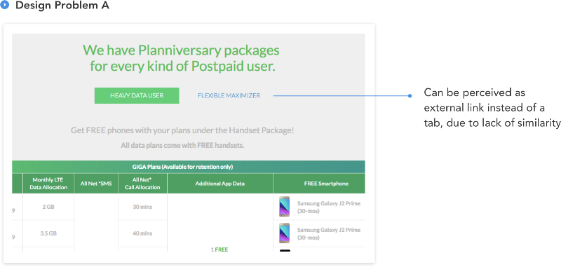 Здесь, помимо границы, окружающей элементы и соединяющей их с основным изображением категории, длинная надпись «Free Netflix for six (6) months for Plans 999 and up» заменена на жёлтый информационный значок, расположенный в правом верхнем углу элемента, к которому она относится. При щелчке по этому значку появляется всплывающая подсказка с дополнительной информацией. Это, кроме прочего, освобождает место для других элементов.