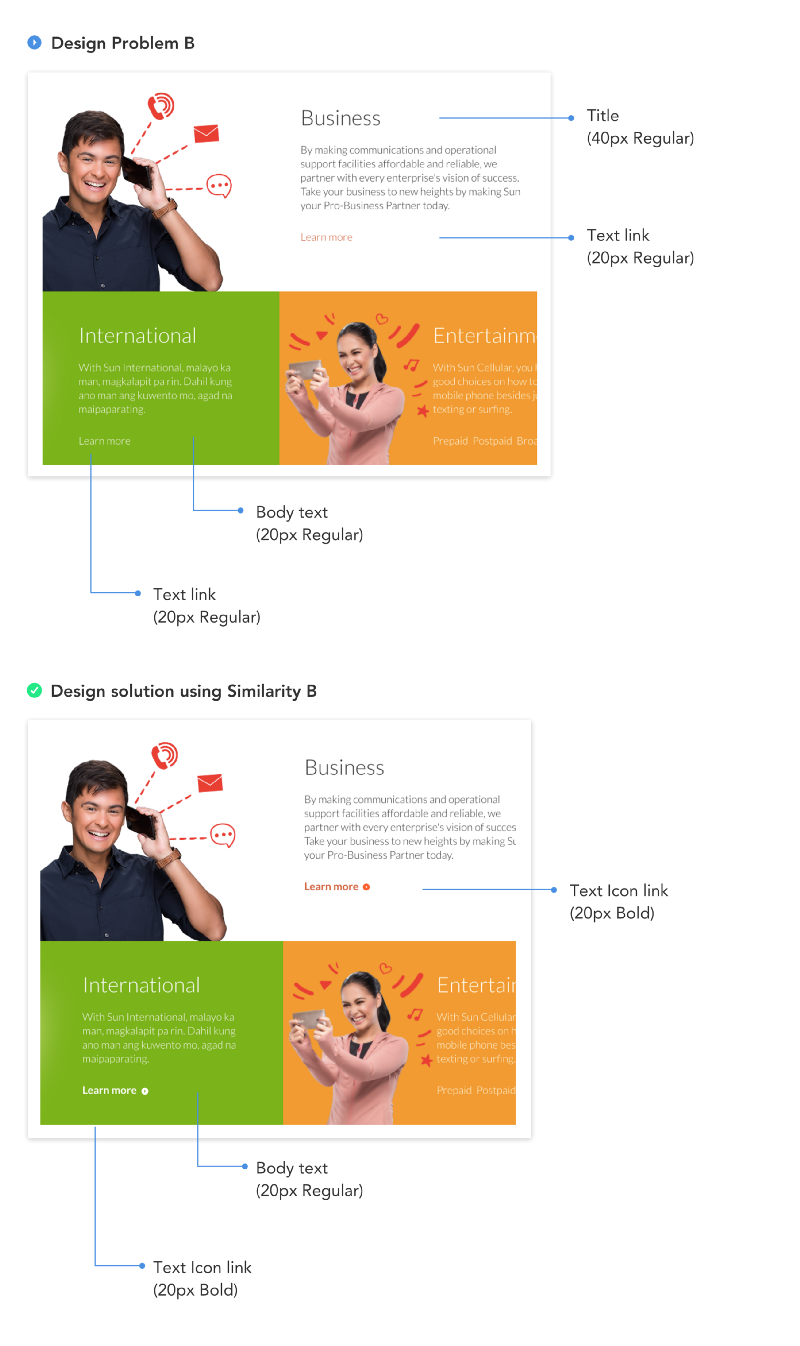 Решение — применить принцип сходства для визуального разделения элементов: сделать текст ссылок более контрастным (полужирным) и добавить иконки, чтобы придать ссылкам визуальный вес.