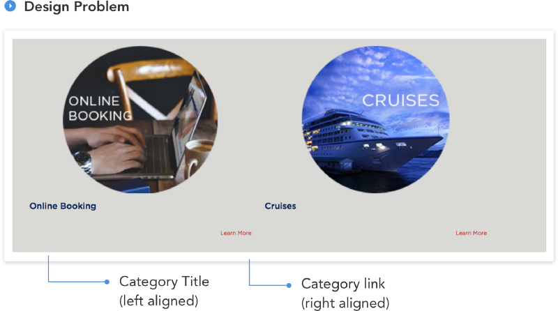 В исходном макете заголовки выровнены по левому краю, ссылки — по правому, а изображения — по центру. Такое расположение мешает воспринимать связку «изображение + заголовок + ссылка» как единую карточку раздела.