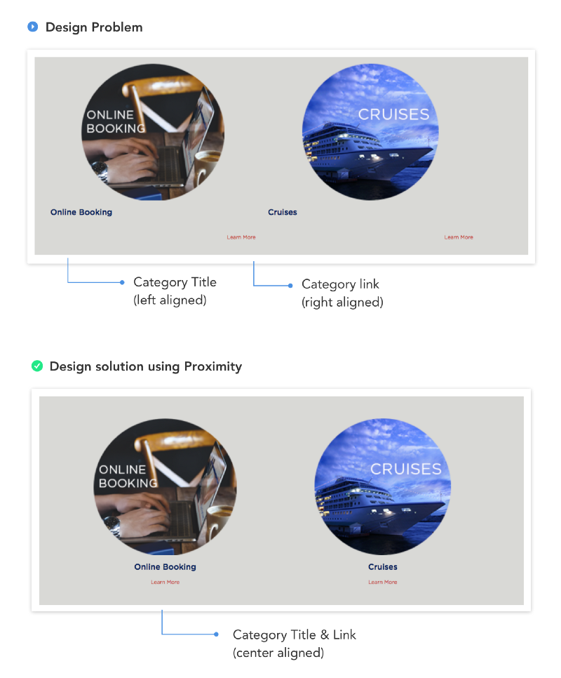 Чтобы применить принцип близости, нужно уменьшить расстояние между заголовком и ссылкой и выровнять их относительно изображения. Это позволяет визуально связать все три элемента в одну группу, что восстанавливает контекст и облегчает восприятие разделов.