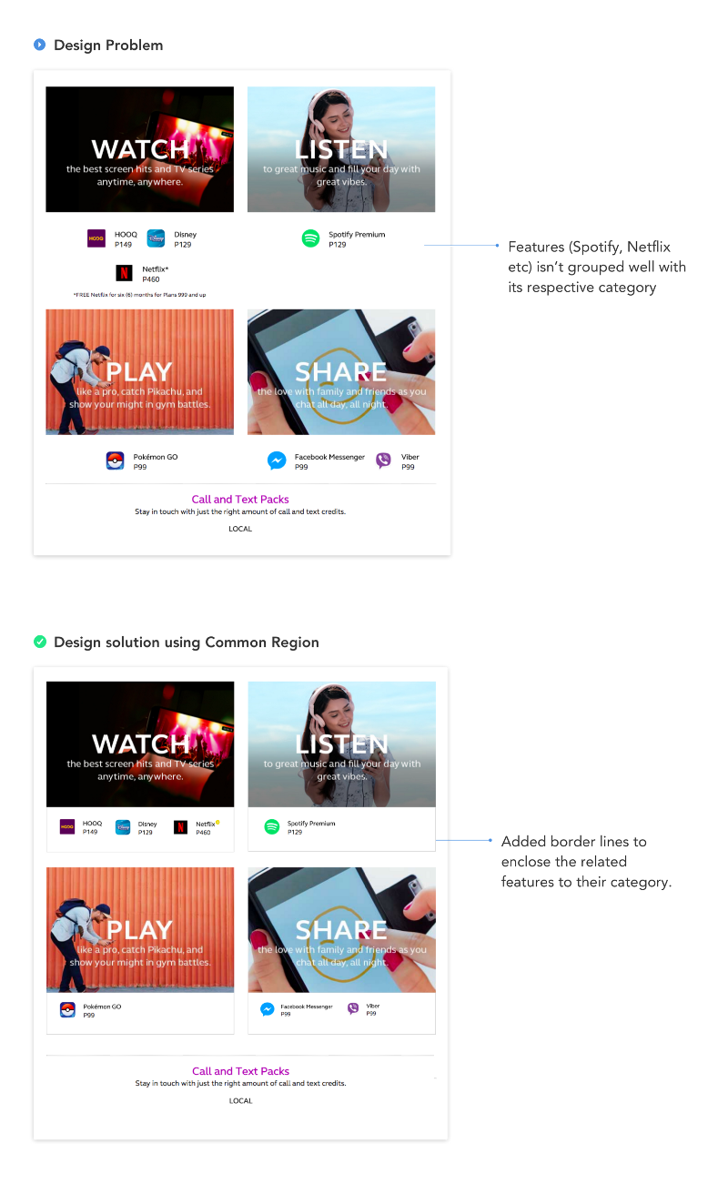 Рассмотрим проблему: элементы типа Spotify, Disney, Netflix, являющиеся дополнительными возможностями для каждой категории, не выглядят как привязанные к конкретной категории. Они воспринимаются как отдельные, «плавающие» элементы.