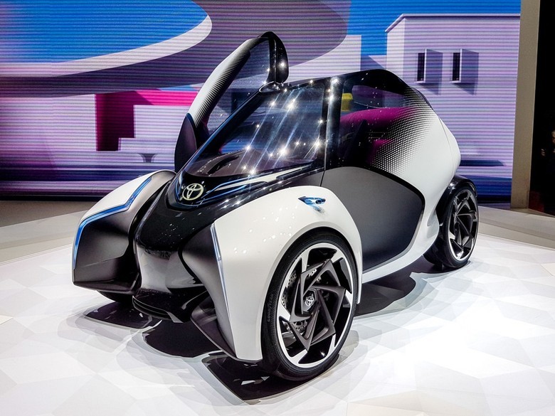 Трёхколёсная Toyota i‑TRIL — концепт, в котором места для пассажиров расположены так, чтобы обеспечить попутчикам максимально хороший обзор. При запуске и остановке электромотора задние кресла поворачиваются на 90°, облегчая посадку и высадку.