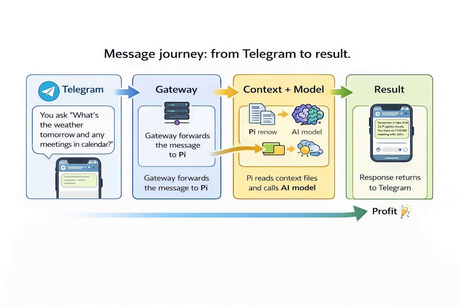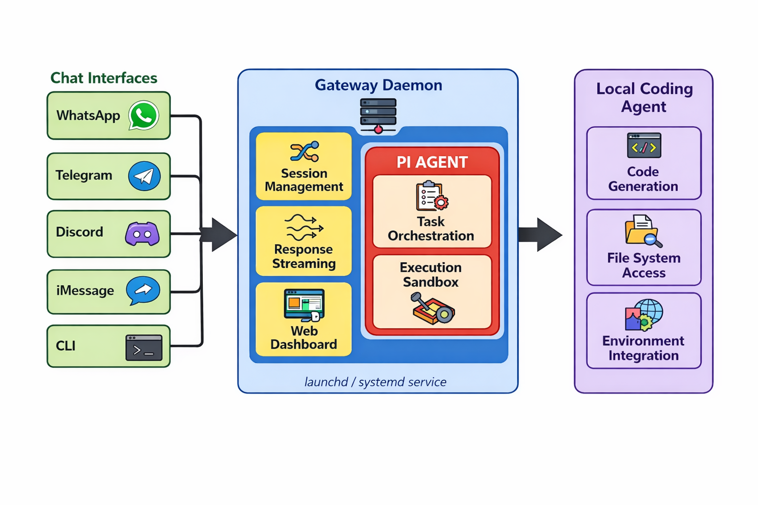 Pi (агент) — исполнитель: получает промпт от Gateway, отправляет в API выбранной модели и выполняет инструкции локально (shell, файловые операции, HTTP‑запросы и т.д.). Запускается как подпроцесс или контейнер.
