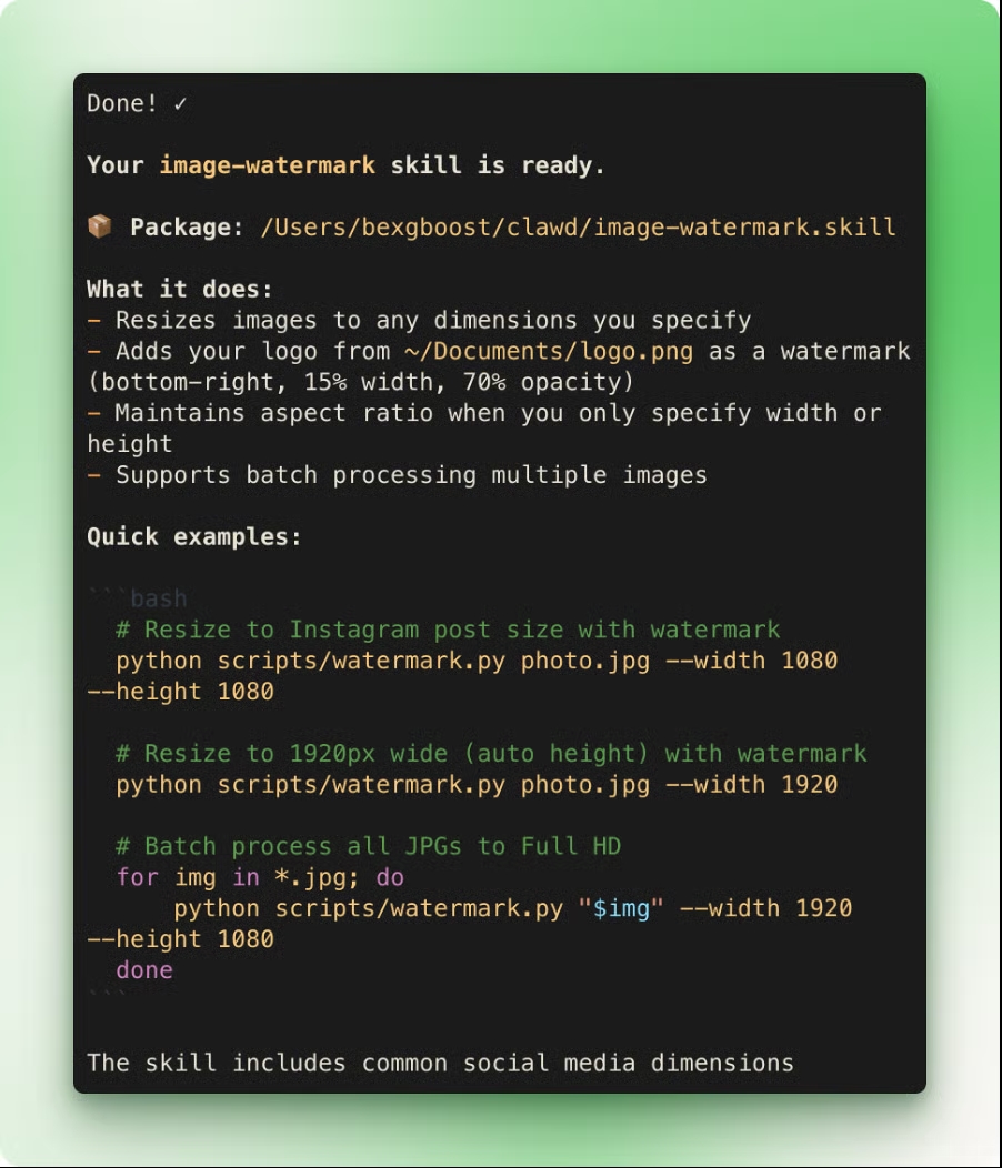 metadata: {"openclaw":{"requires":{"bins":["gh"]}}}Поле requires.bins служит как gating: если нужный бинарник отсутствует, skill не активируется. OpenClaw может генерировать skeleton skill из вашего описания — попробуйте дать агенту задачу и сказать «запомни как skill».