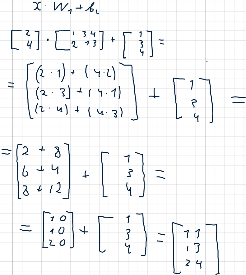 Вектор входных значений можно обозначить как x, а матрицу весов первого слоя — как W1. Вектор смещений — b1.
