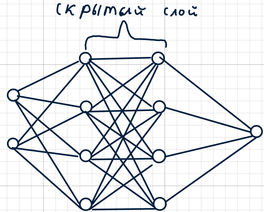 Скрытый слой — часть сети, недоступная пользователю напрямую, где происходят основные вычисления. Скрытых слоёв может быть один или несколько, в каждом — любое количество нейронов.