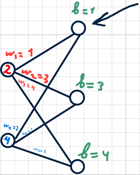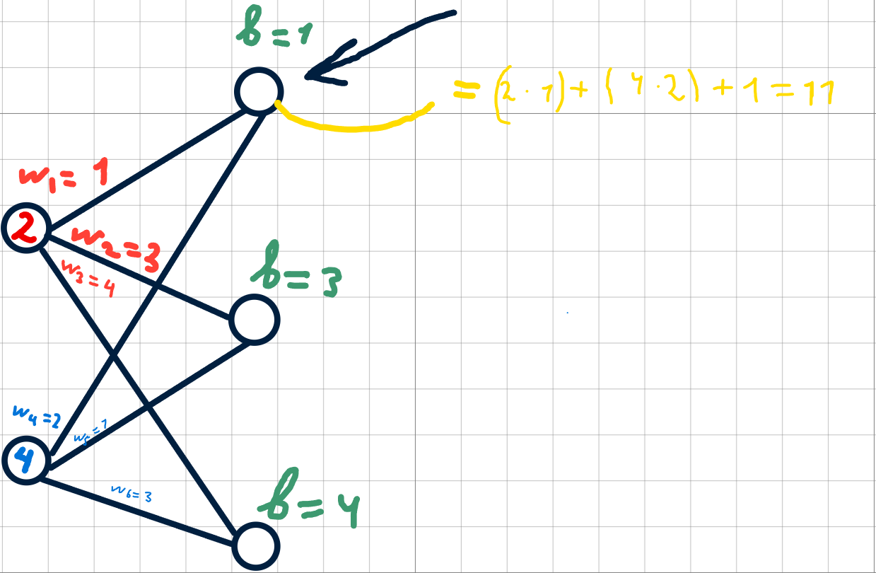Необходимо умножить значение первого входного нейрона на соответствующий вес, прибавить произведение второго входного нейрона на его вес и добавить смещение. Проще это видеть на картинке: