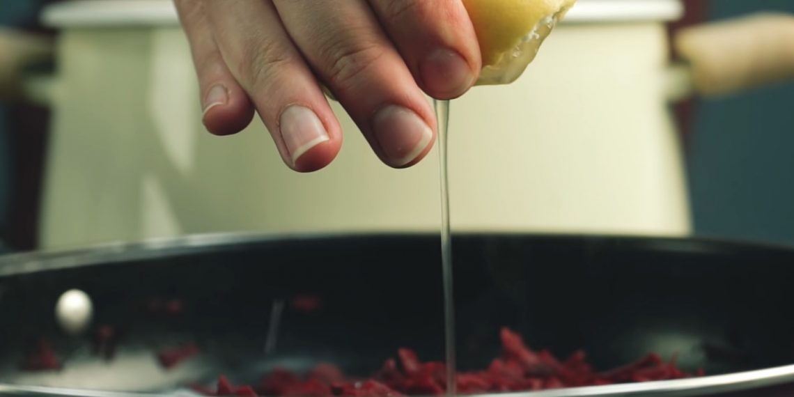 Затем выложите свёклу. Добавьте к ней лимонную кислоту, уксус или сок лимона. Благодаря этому классический борщ будет по-настоящему красным и приобретёт приятную кислинку.