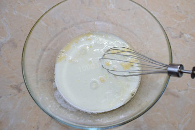 Для приготовления теста на оладьи возьмите удобную, просторную чашу. Разбейте в чашу яйцо и добавьте сахар и соль. Количество сахара можно изменить по своему вкусу. Немного взболтайте все с помощью венчика, чтобы масса стала однородной.