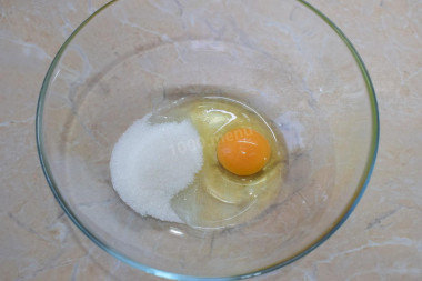 Шаг 2. Для приготовления теста на оладьи возьмите удобную, просторную чашу. Разбейте в чашу яйцо и добавьте сахар и соль. Количество сахара можно изменить по своему вкусу. Немного взболтайте все с помощью венчика, чтобы масса стала однородной.