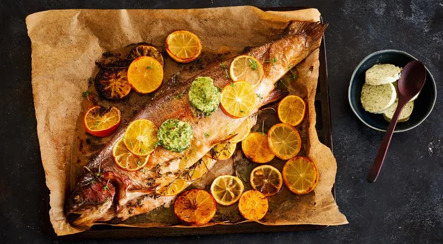 Этот вариант особенно понравится тем, кто любит свежие натуральные вкусы: рыбу маринуют в свежевыжатом цитрусовом соке и запекают целиком, подают с ароматным растопленным маслом, приготовленным прямо перед подачей.