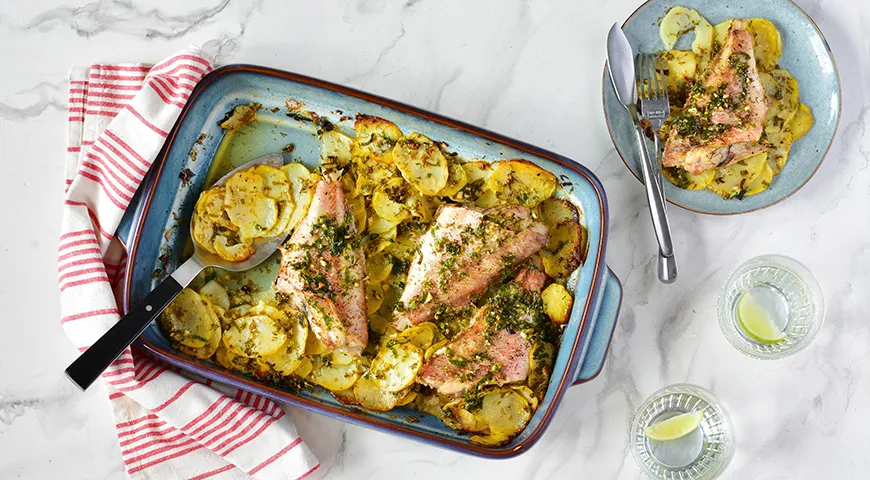 Запечённый окунь с картофелем — рецепт рыбы в духовке