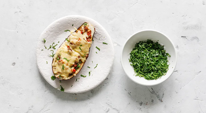 Разогрейте духовку до 220 °C. Застелите противень пергаментом, разместите на нём баклажанные лодочки и запекайте 15–20 минут.