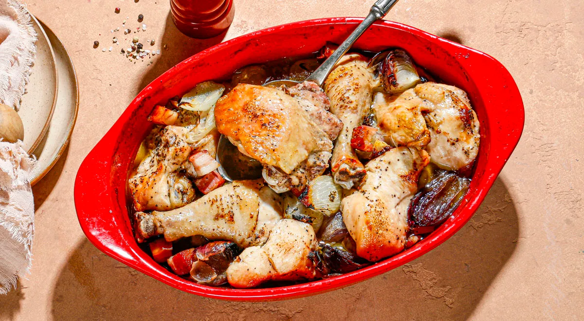 Запеченная курица по‑деревенски — рецепт в духовке с грудинкой и луком