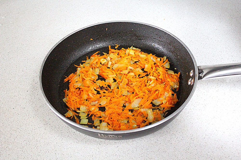 На горячей сковороде разогрейте масло и обжарьте лук с морковью на среднем огне до полуготовности. Как масло можно использовать оливковое, гхи, сливочное или растительное.