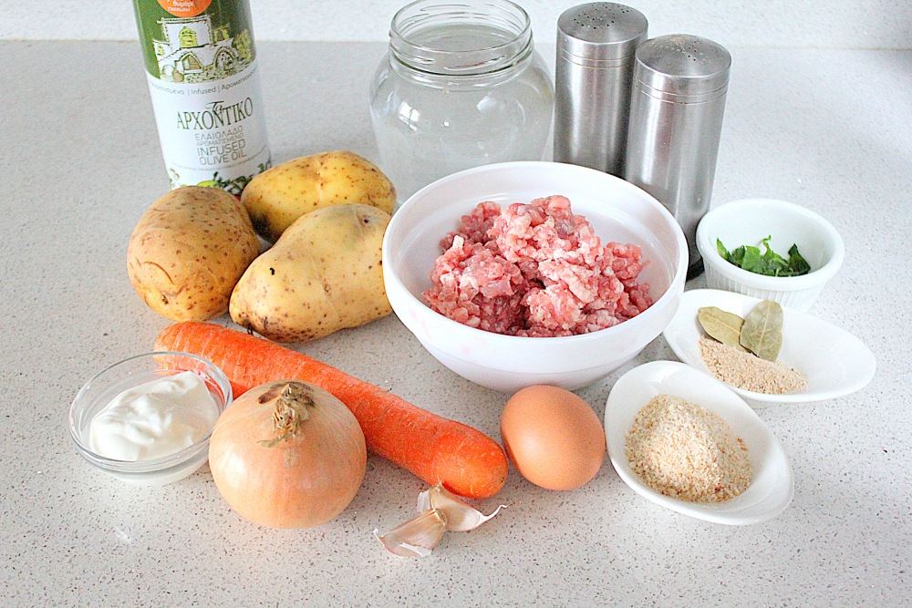 Подготовьте все продукты: мясной фарш, лук, морковь, картофель, чеснок и зелень. В рецепте использована свиная шейка, перемолотая в фарш — это даёт уверенность в качестве.