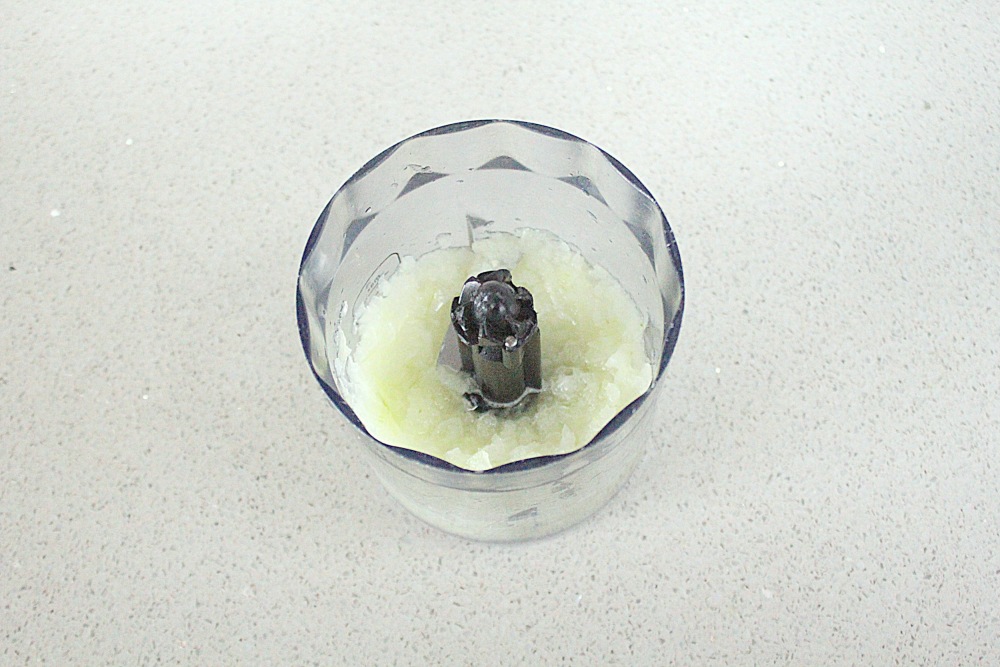 Вторую половину лука поместите в блендер с ~40 мл воды и измельчите. Полученную массу добавьте в фарш для фрикаделек.