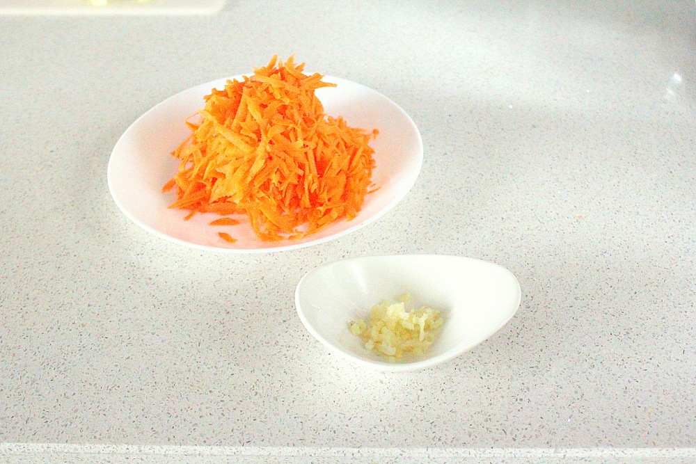 Морковь очистите и натрите на тёрке, чеснок пропустите через пресс. Натирание моркови обычно быстрее, чем нарезка ножом.