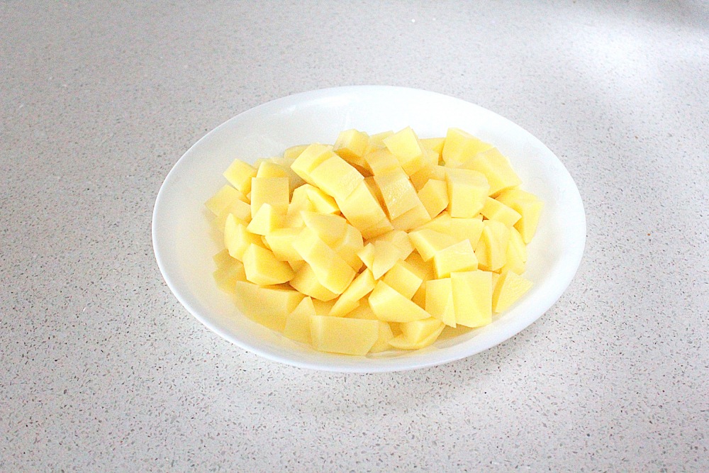 Картофель очистите и нарежьте кубиками среднего размера, чтобы он успевал приготовиться одновременно с фрикадельками.