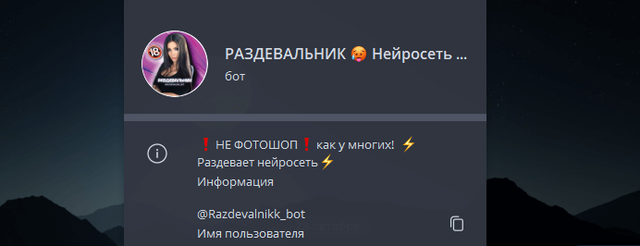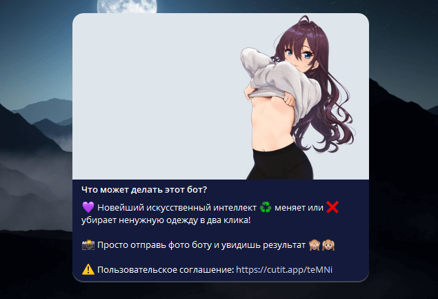 Бот предлагает бесплатное «раздевание» девушек на фото с помощью нейросети. Заявляется, что именно этот сервис способен аккуратно и качественно оголять модели.