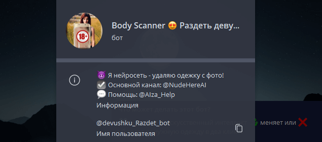 Относительно свежий бот в Telegram, который позволяет убрать одежду с девушки по снимку. Сервис регулярно обновляют, а результат позиционируется как более качественный. Иногда Telegram его банит, но создатели выпускают зеркала, чтобы сохранить доступ.